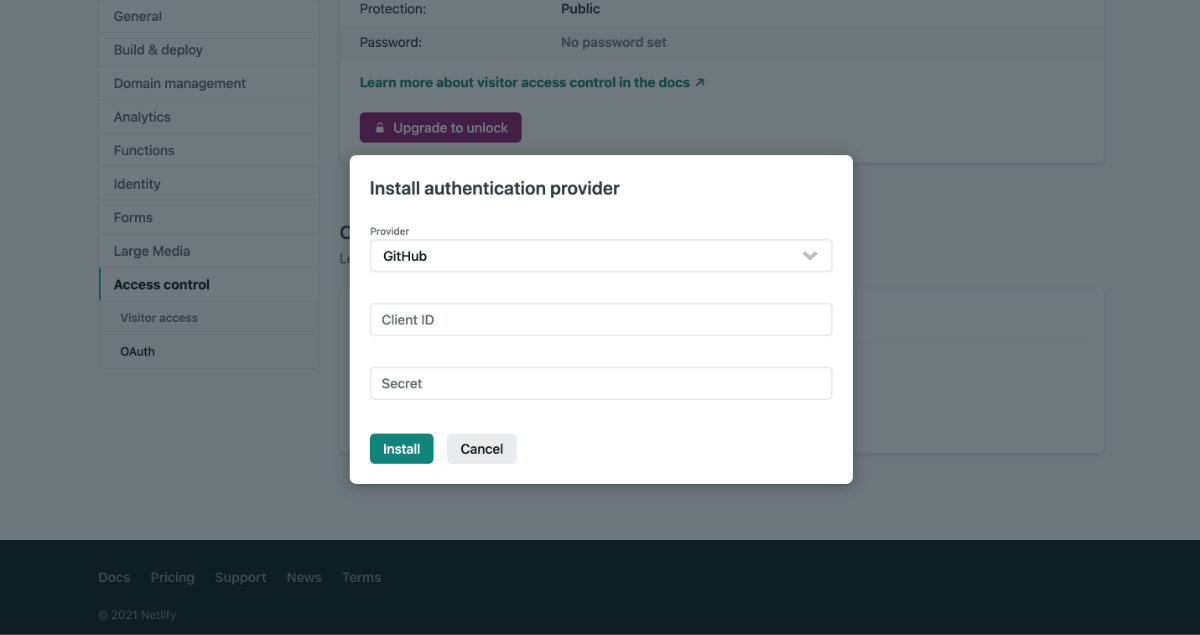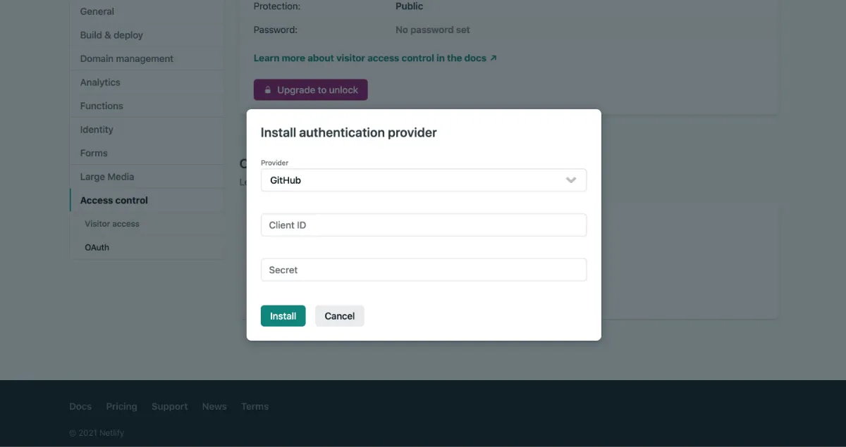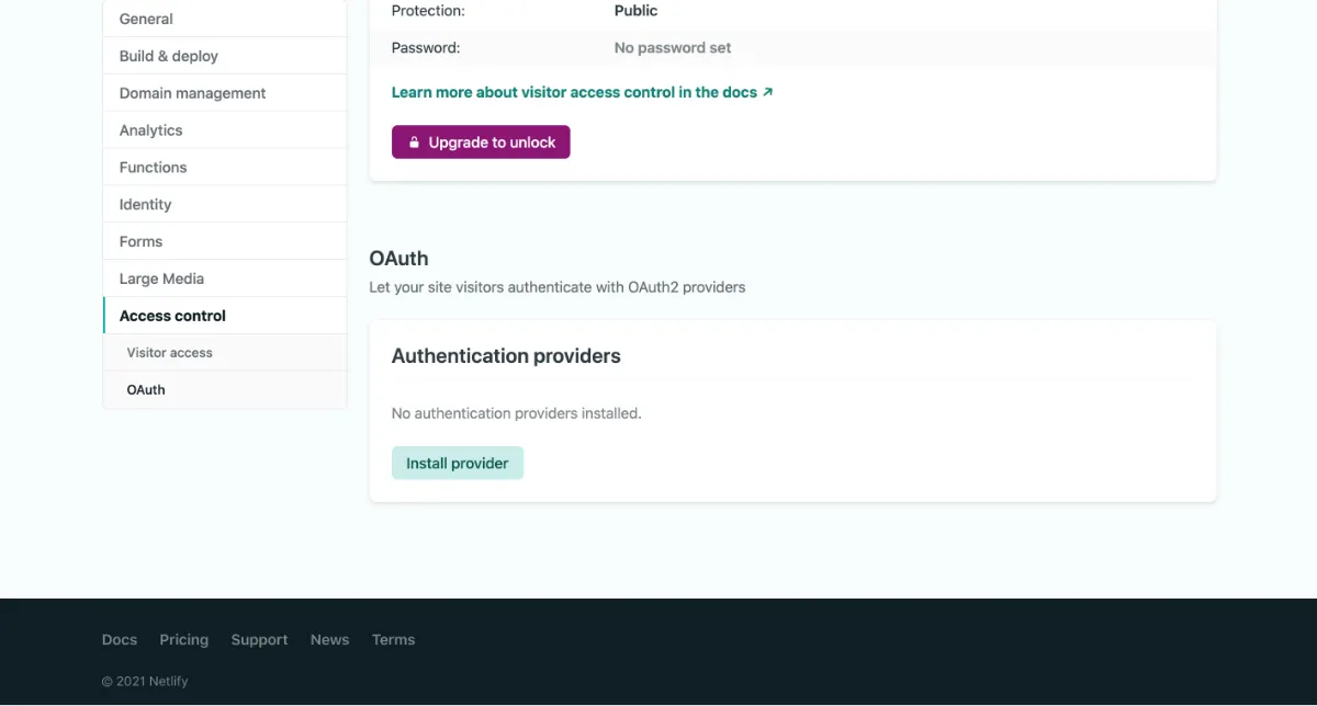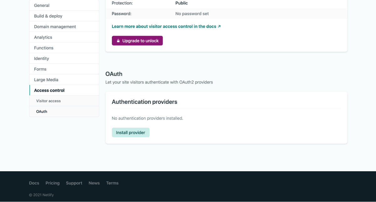 ③ Netlifyの管理画面にアクセスし、 Site settings > Access control > OAuth に移動してプロバイダーをインストールします。