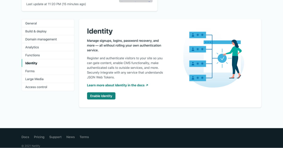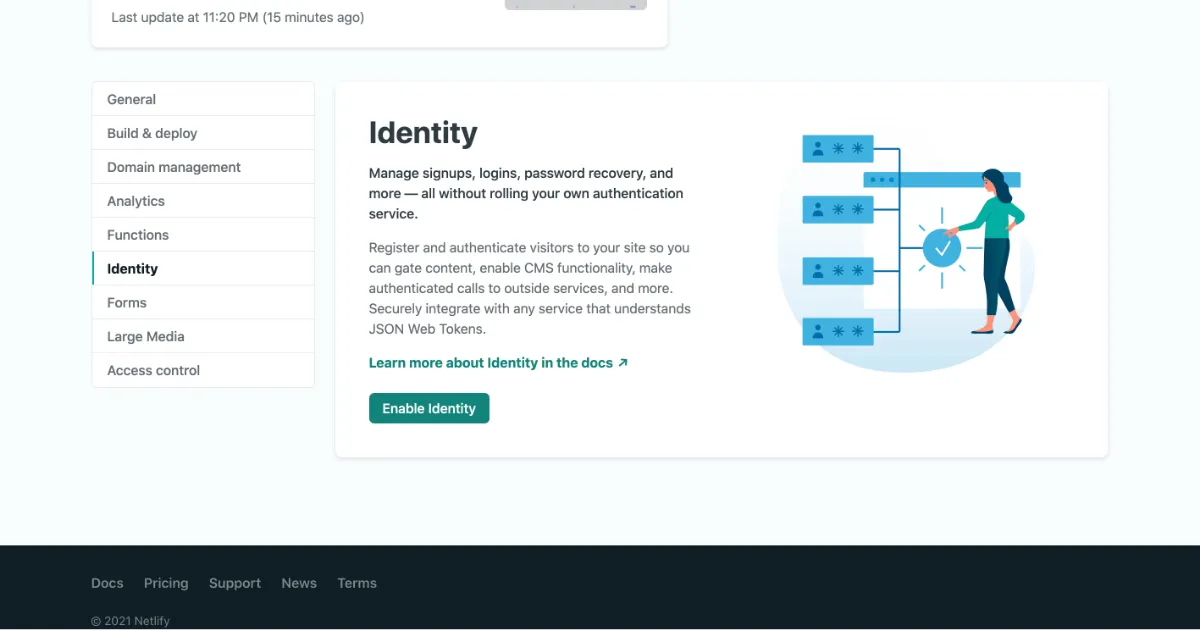 ⑤ 引き続きNetlifyの管理画面で Site settings > Identity に移動し、「Enable Identity」をクリックします。