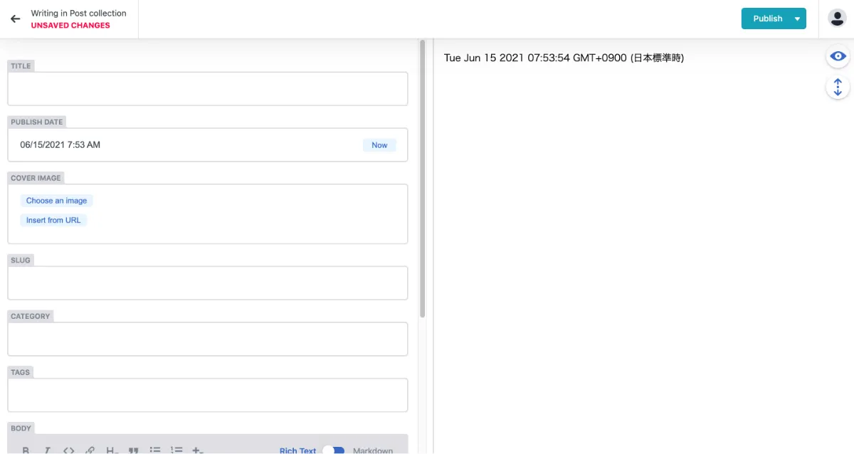 テスト投稿をしてみます。入力が終わり右上の「Publish > Publish now」をクリックすると記事が保存され、自動的にNetlifyでデプロイが開始されます。