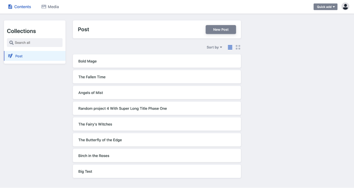 ログインに成功するとNetlify CMSのダッシュボードが表示されます。記事一覧にはStarterに用意されていたサンプル記事が読み込まれています。