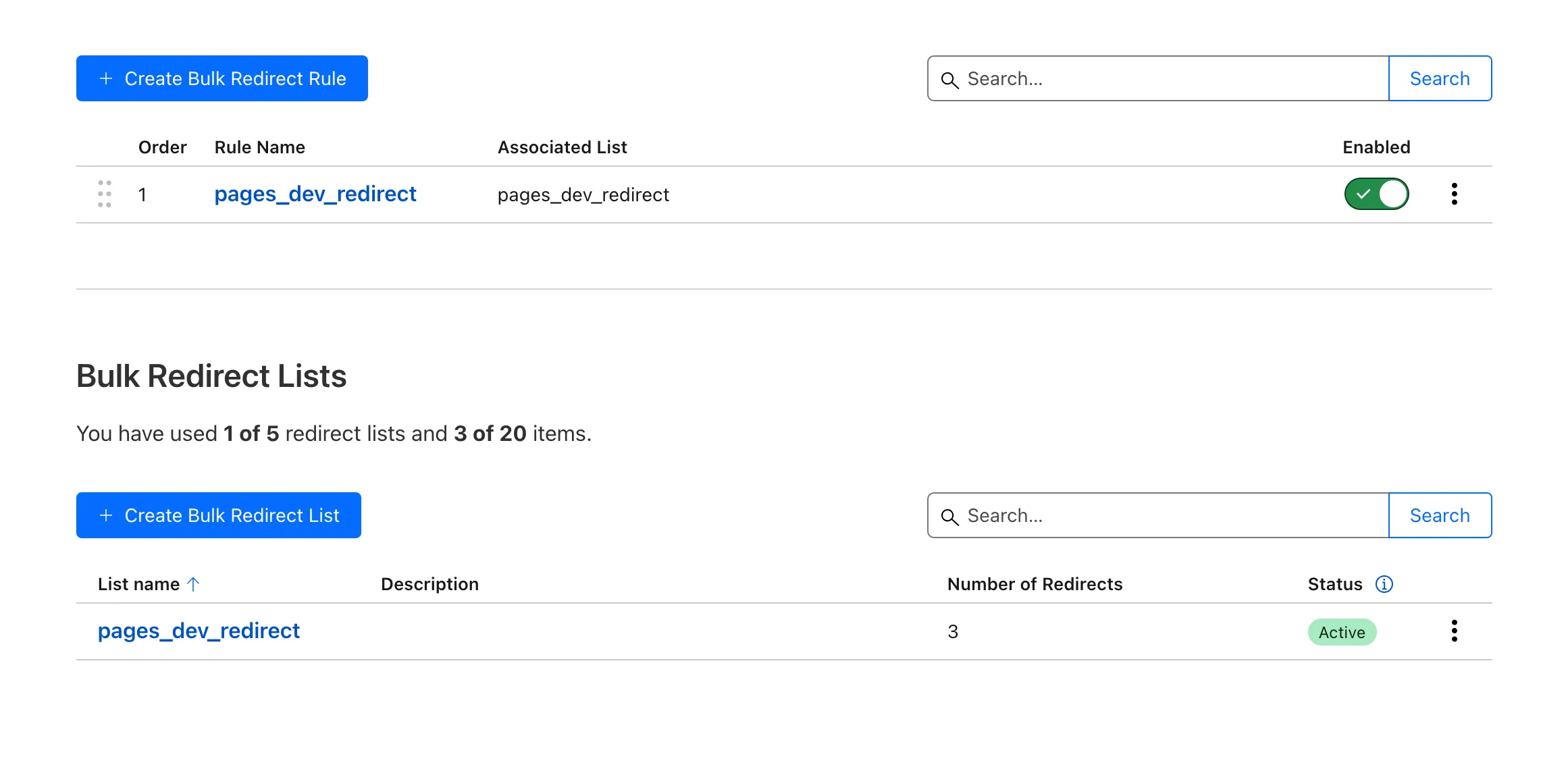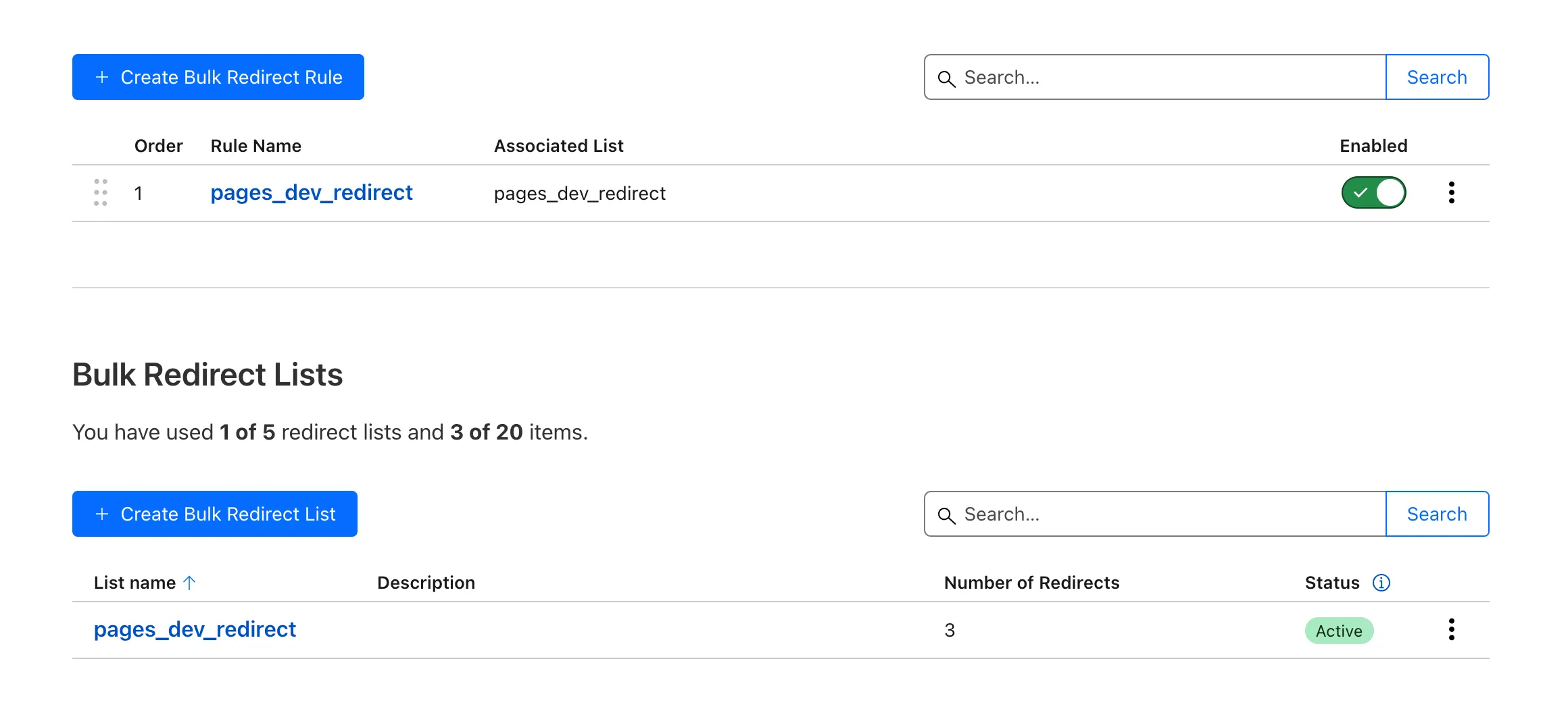 「Save and Deploy」をクリックして、Bulk Redirect ページでルールの Enabled にチェックが入り、リストの Status が「Active」になっていれば設定完了です 🎉