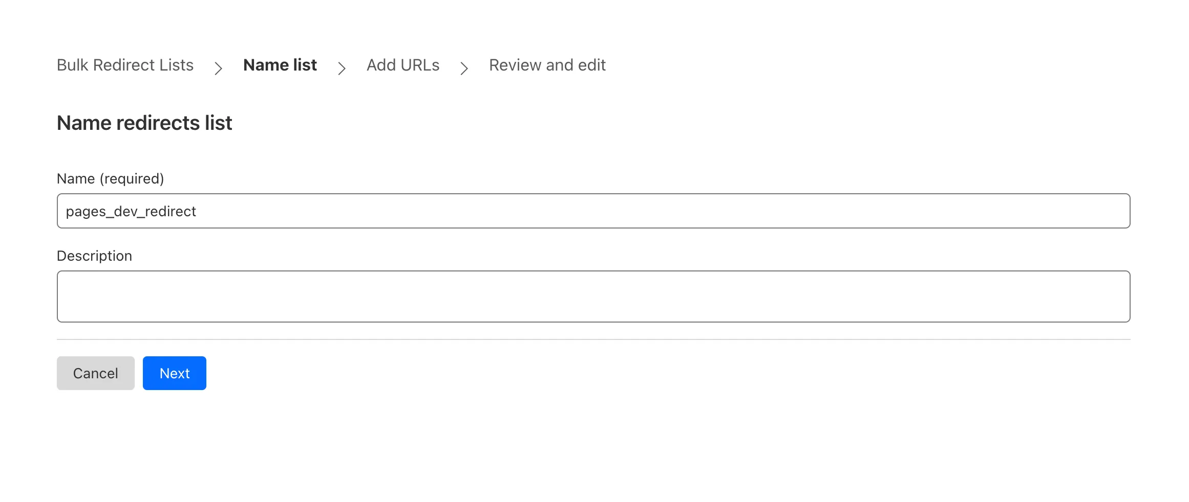 ルールに名前を付けて、先ほど作成したリストを選択します(1 つしかない場合はデフォルトで選択済みの状態になっています)。 Bulk Redirect Lists が複数ある場合はリダイレクトを適用したいリストを選択します。