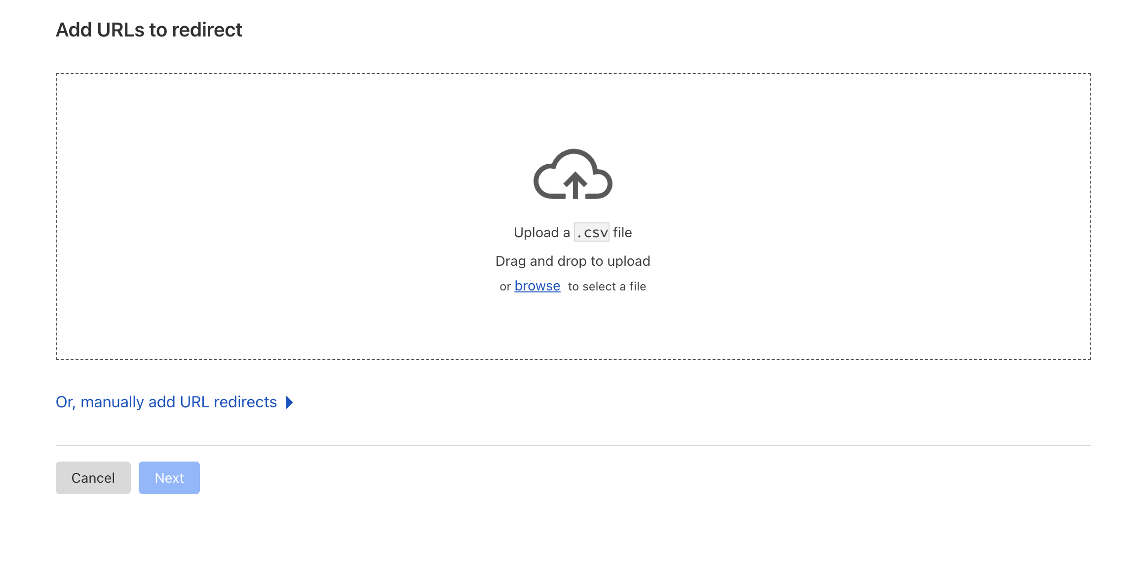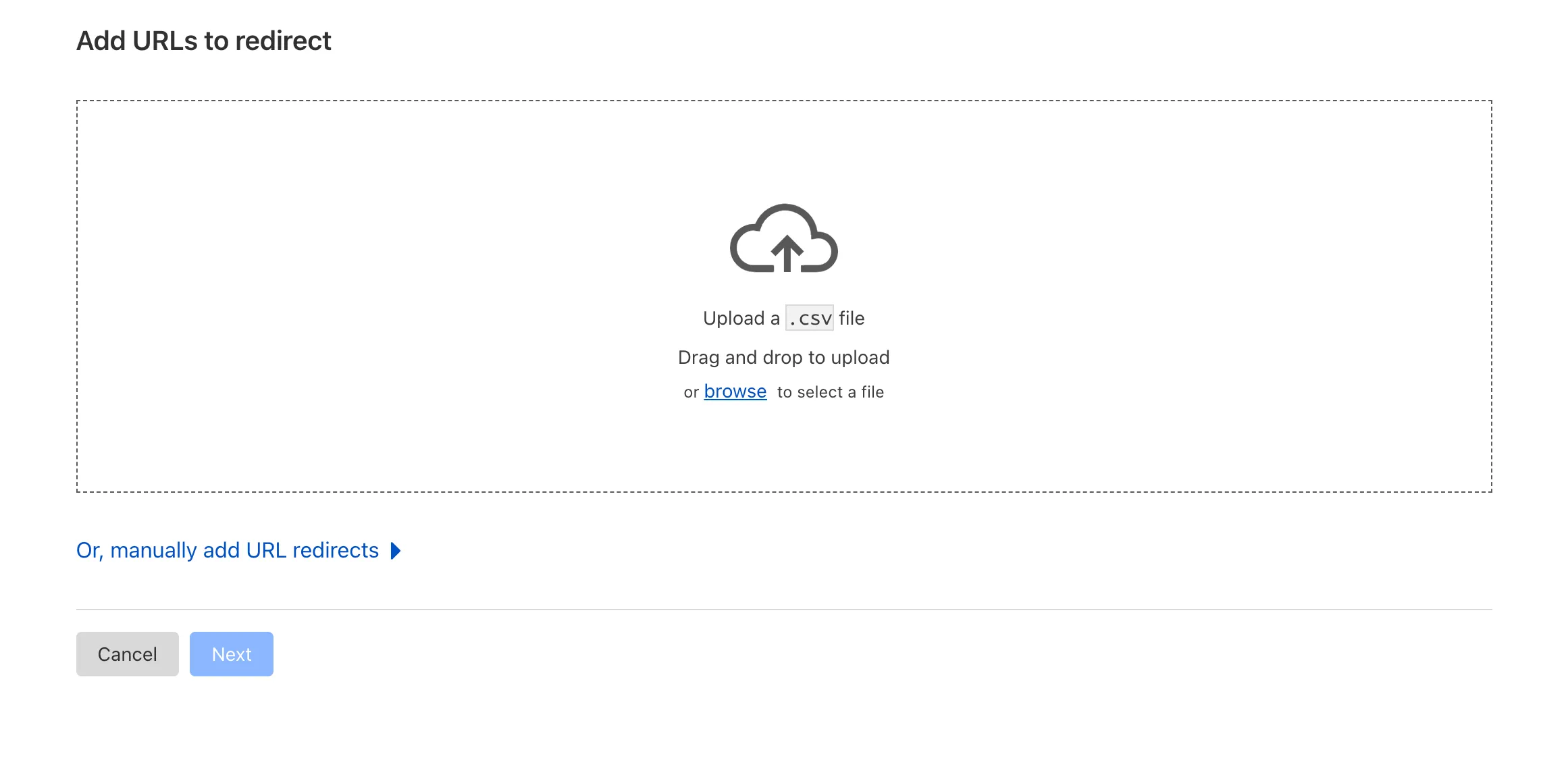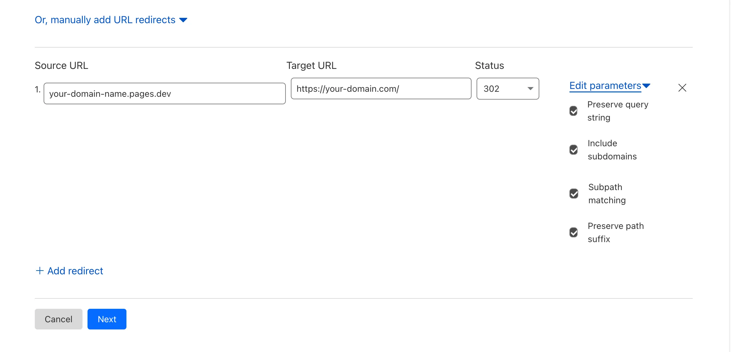 「Or, manually add URL redirects」をクリックするとトグルが開いて入力欄が表示されるので、必要な項目を入力します。入力が完了したら「Next」をクリックします。