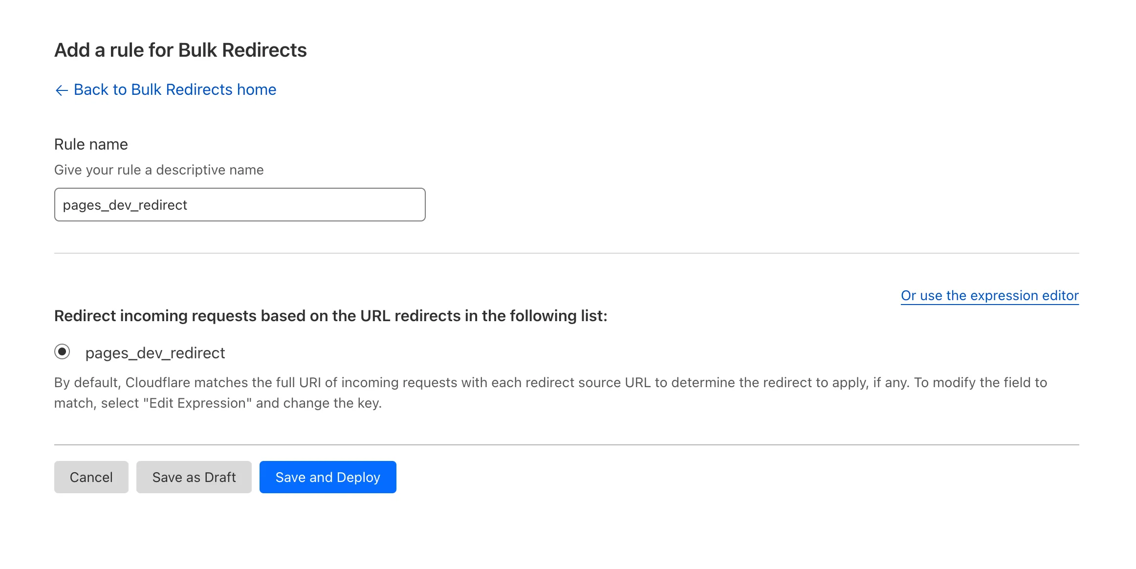 Bulk Redirect Lists 作業の続きから作成するか、Bulk Redirects の「Create Bulk Redirect Rule」をクリックして作成します。